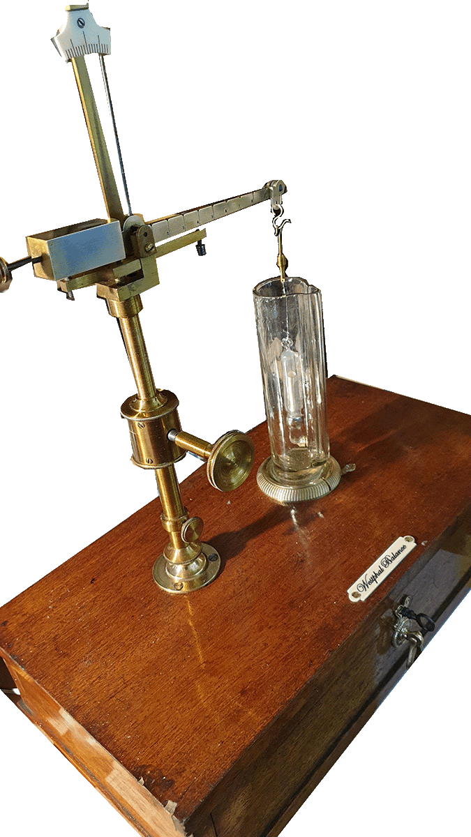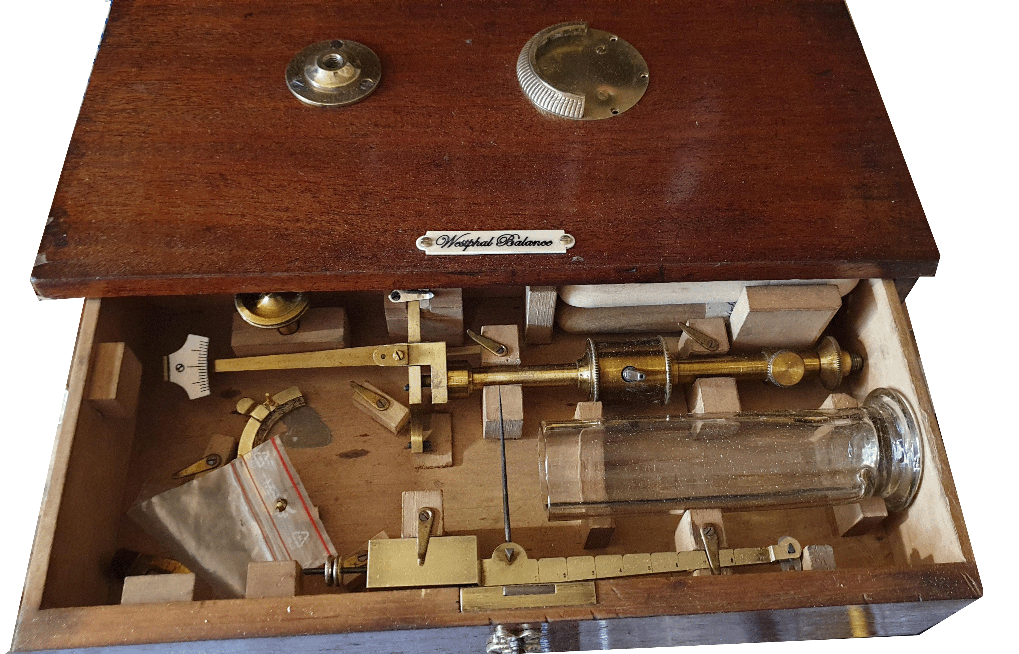 La balance aréothermique de Westphal est utilisée pour déterminer, rapidement et avec une bonne précision, la densité des liquides. Elle est équipée d'un plongeur en verre de volume V, muni d'un thermomètre, et d'une série de cavaliers, de masse M (2 pièces), M/10 et M/100. V et M sont tels que si V = X cm3, M = X g. Le volume du plongeur étant de 5 cm3, les deux plus gros cavaliers pèsent chacun 5 g et les deux suivants 0,50 et 0,05 g. La partie droite du fléau est divisée en 10 parties égales entre le couteau central, axe du fléau, et le couteau extrême auquel est assujetti un crochet de suspension. La partie gauche se termine par un contrepoids dont la pointe sert à repérer la position d'équilibre.