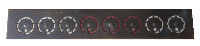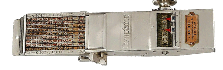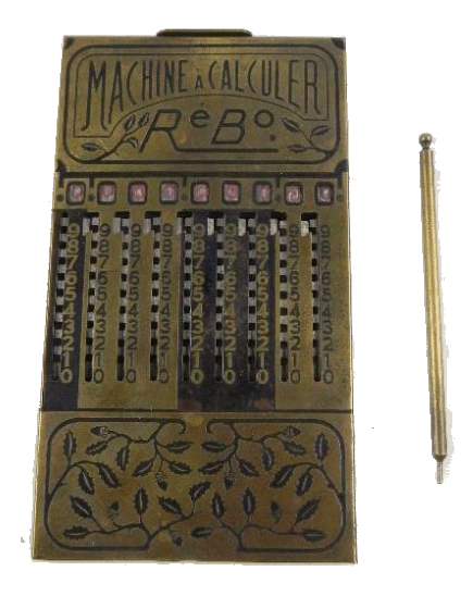 Fabriquée de 1900 – 1960 par Reliable Typewriter and Adding Machine Co., Chicago, USA. Dimensions 296 x 50 x 15 mm. Opération avec un stylet. Modèle métrique avec 8 disques gradués de 0 à 9