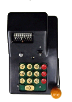 Calculatrice à tiges glissantes ou à chaines, fabriquée par Hans Sabielny à Dresden (D). On entre un chiffre en tirant avec un stylet la plaquette correspondante vers le bas. Une fois que l'ensemble des chiffres qui compose chaque opérande a été saisi, on arme le levier à gauche en le relevant. Cela a pour effet de faire apparaître sur l'afficheur en partie basse de la machine, soit le premier opérande saisi, soit le résultat de l'opération qui vient d'être effectuée. La molette sur la partie droite qui ne peut être tournée qu'après l'avoir écartée du boitier permet de de Les barrettes Il existe des modèles à 9 ou 13 chiffres.